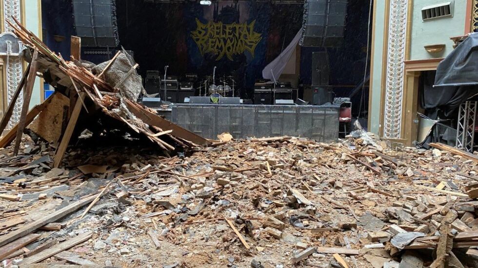 Part of the theater’s roof ripped off and smashed into the windows of a vacant storefront across the street. The roof over the stage caved in, and its marquee awning toppled to the front sidewalk.