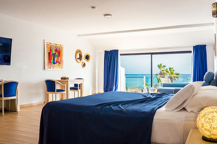 This 307-room all-inclusive adults-only resort is set on an eight-kilometre sandy beach, and whether it is wellness, sports or entertainment you are after, all are available. Palm trees pepper the spacious grounds, and there’s a watersports station offering kitesurfing, windsurfing, sailing and e-foiling, and there is a gym plus group fitness sessions such as yoga, a rooftop sauna and spa treatments too. You’ll also find football, volleyball and cross boccia, and – as well as three restaurants and three bars, live shows and music – DJs and other events are all organised. Rooms could perhaps benefit from a bit of updating, and are in a brown, cream and white palette.