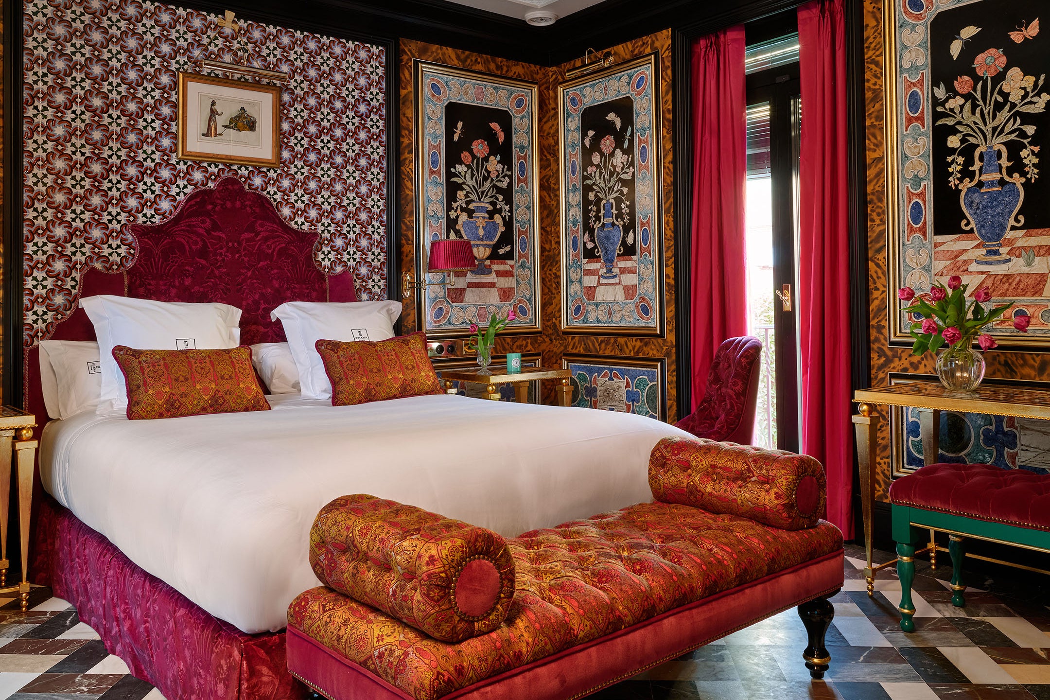 Be swept away to Moorish Seville at this exquisite hotel next to the Macarena arch in the northern part of the city centre. Vibrant colours – gold, ochre, magenta, and deep red – set the tone. Canopied four-posters, carved headboards, stucco arches, brilliant lamps, and geometric tiles create a One Thousand and One Nights feel in the 18 rooms, each named after a famous figure from Moorish Seville. We especially loved the spa tubs set in their own alcoves and there is another tub on the roof terrace along with day beds. On the ground floor, El Rincon de Rosita is a friendly tapas bar, famous for its guisos (stews): try the pork in tomato sauce. All the furniture is for sale.