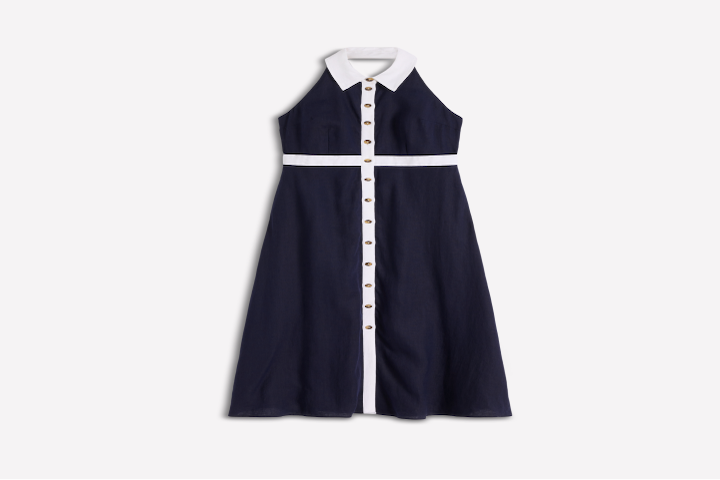 Perfect for sunny days, this linen halterneck dress features a button-through front, contrast white piping and a flattering fit-and-flare shape.