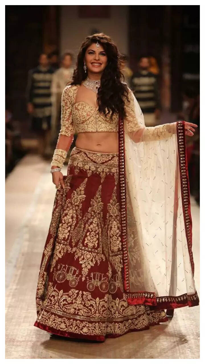 Jacqueline walked the ramp for Anju Modi during Lakme Fashion Week in the intricately detailed the lehenga and the sheer blouse