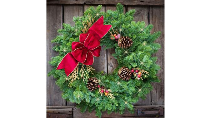 Welcome the advent of the holiday season with a fresh cranberry splash wreath. This 28-inch noble fir wreath comes festooned with floral picks, jingle bells and pinecones with a red velvet bow to top it off. An LED light string set is included and requires AA batteries (not included) for lighted use.