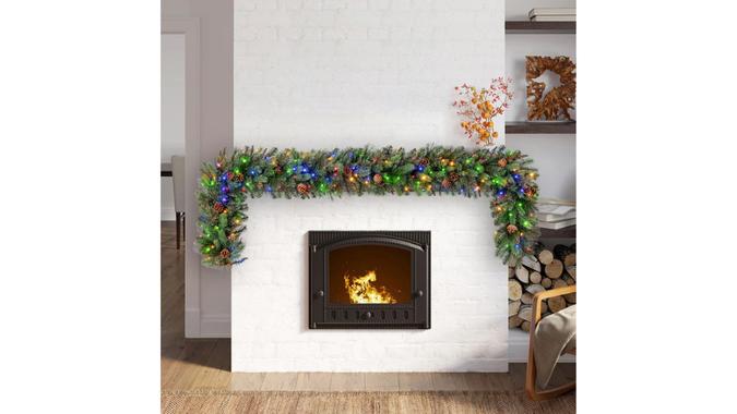 Decorate mantles, bannisters and more surfaces with a deluxe pre-lit greenery garland. Measuring at nine feet, this artificial garland is designed with an assortment of pinecones and 150 white and multi-colored lights set to a twinkle function. You can even use it outside in covered outdoor spaces.