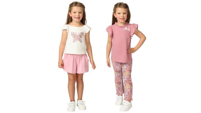 Each set includes a pair of pants, shorts and two tops in blue (dinosaur), red (outer space), yellow (flowers) or pink (butterfly) designs.