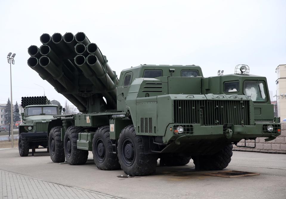 The heavy rocket artillery brigades count 24 powerful BM-30 Smerch multiple rocket launcher systems with a range of 56 miles (90km). Multiple BM-30 units have been sighted in Belarus and Russia’s border with Ukraine.