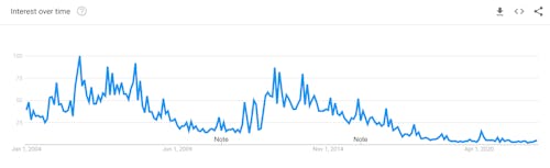 The Wayback Machine reveals that the site has barely changed in two decades and Google Trends shows that searches for 123Greetings are way down from their peak periods in the mid-2000s and early 2010s. The Careers section of the website still capitalizes the “I” in internet; the media kit includes activity stats from the years 2006, 2007, 2008, and 2009.