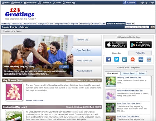 For most people, National Pizza Party Day (coming up on May 20!) is just another mostly-irrelevant internet holiday, but on 123Greetings.com, it’s worth advertising smack dab on the front page.