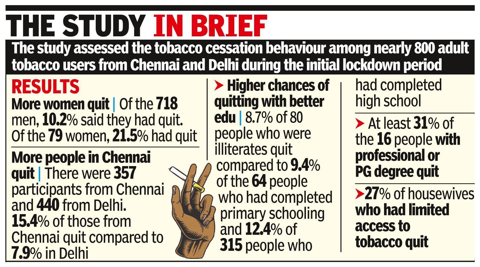 CHENNAI: At least 11.3% of tobacco users in Delhi and Chennai said they had quit using tobacco after the Covid-19 lockdown in 2020, according to a cross-sectional study done by a group of scientists.
