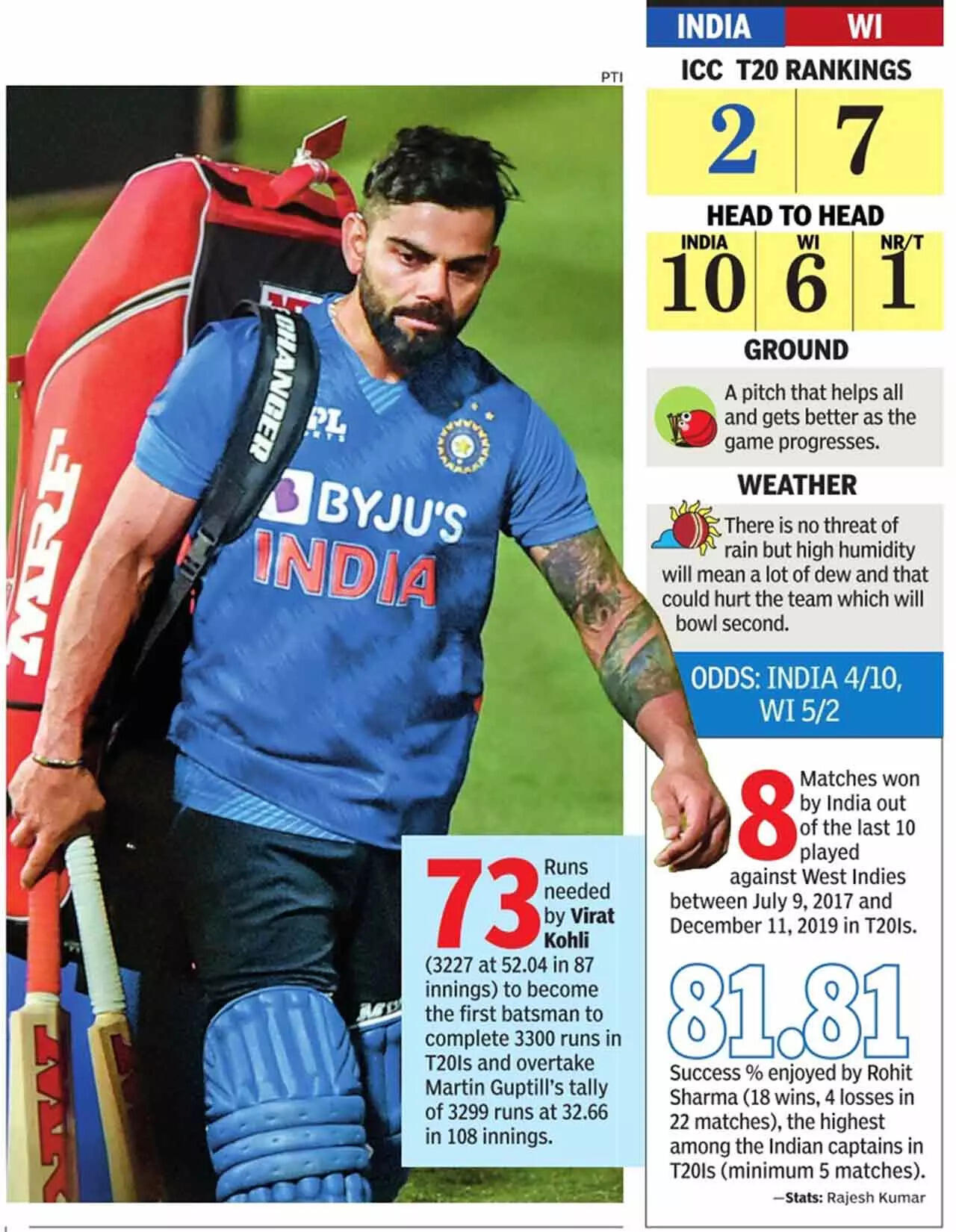 In spite of that, the Men in Blue cannot afford to take their rivals lightly. The West Indies are known to be one of the most dangerous units in world cricket in this shortest format. No wonder, they contribute a large number of foreign players to the IPL.