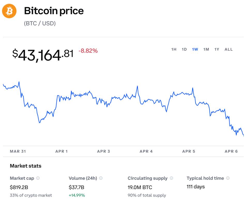 Ripple's XRP and Terra's luna are down 5% and 7% respectively, while the meme-based dogecoin, which had soared this week following Tesla billionaire and dogecoin supporter Elon Musk buying a major stake in Twitter and joining its board, has crashed 13%.