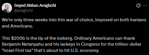 "We're only three weeks into this war of choice, imposed on both Iranians and Americans. This $200b is the tip of the iceberg. Ordinary Americans can thank Benjamin Netanyahu and his lackeys in Congress for the trillion-dollar "Israel First tax" that's about to hit US economy," he wrote on X citing a news report.