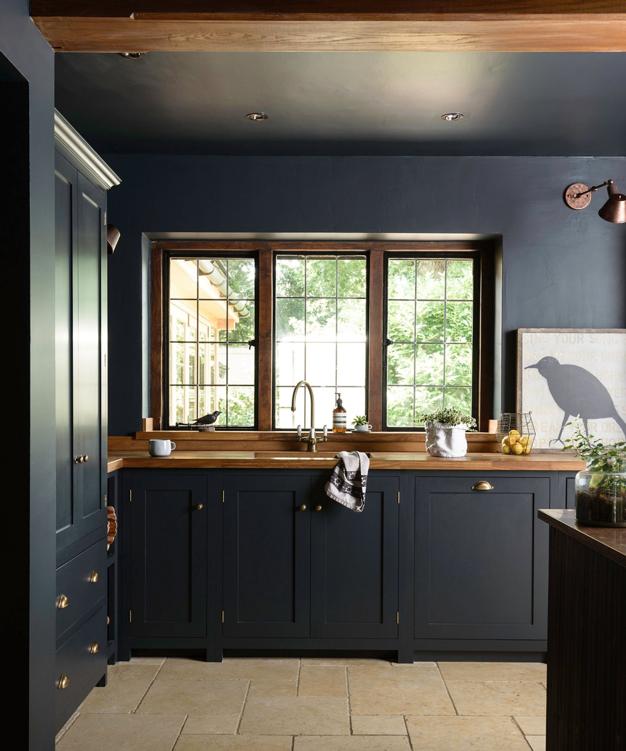 In this kitchen, the spotlights integrate seamlessly into the ceiling, blending with the moody hue drenched throughout the room. Similarly, you could opt for an aged brass design for a more traditional look – it's simply about moving away from the basic, plastic-adjacent white spotlights that make a kitchen feel a bit dated.