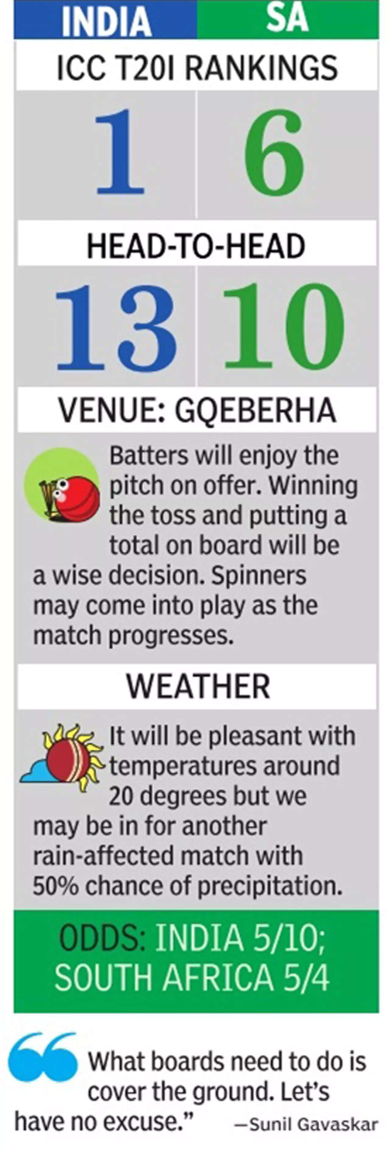 NEW DELHI: The Indian cricket team faces a weather-induced challenge as they gear up for the second T20 International against South Africa on Tuesday after the washout in the series-opener.