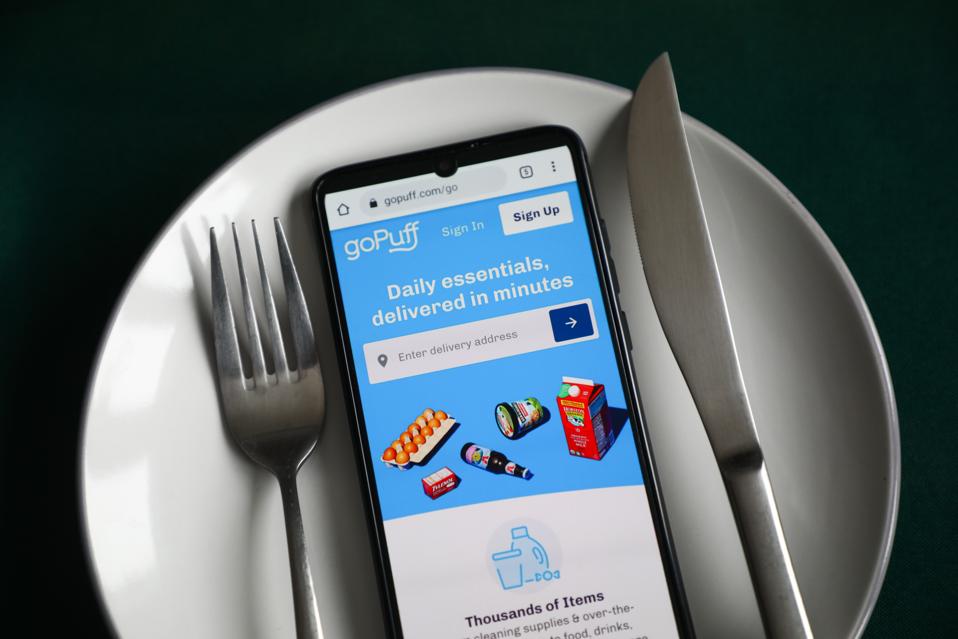GoPuff app logo is displayed on a mobile phone screen photographed for illustration on a plate and with cutlery. Numbers show that the Covid-19 pandemic resulted in a significant increase of meals ordered online through food delivery apps and websites. (Photo illustration by Beata Zawrzel/NurPhoto via Getty Images) NurPhoto via Getty Images