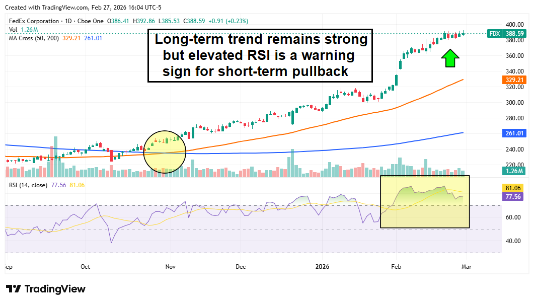 FedEx was also the first company to sue the U.S. government for a refund following the Supreme Court decision. If the suit is successful, the firm could be eligible for up to $1 billion in tariff relief and garner plenty of goodwill by returning some of that windfall to shippers. One note of concern: investors expected bullish news for FDX shares, and the stock is currently overbought according to the Relative Strength Index (RSI). A return to support at the 50-day moving average might present a more stable entry point for new positions.