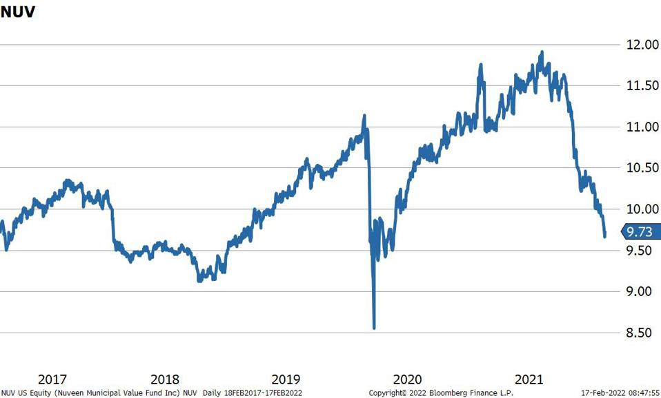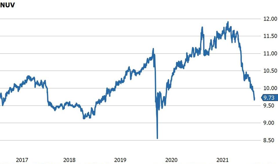 One of the best and easiest ways to take advantage of the cheapening is through closed-end bond funds (“CEF”), which are now trading at steep discounts to NAV. Given projections for rate hikes by the Fed this year, investors should stick to funds that don’t deploy leverage. Leveraged funds may have to cut their dividend if short-term interest rates rise. The most liquid unleveraged CEF is the Nuveen Municipal Value Fund, NUV.