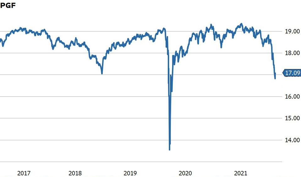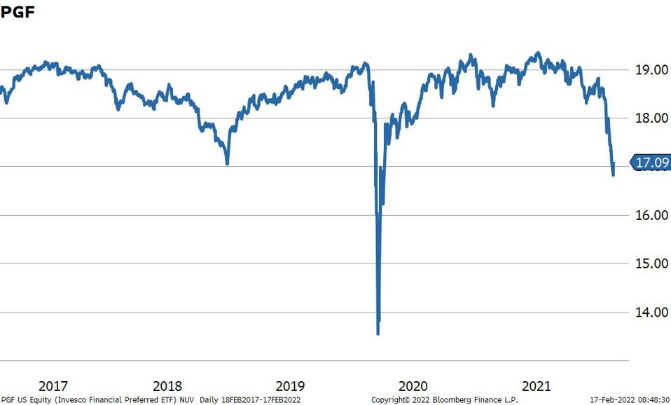PGF invests in fixed-rate U.S. dollar preferred securities issued by financial companies and has an expense ratio of 0.61%. As of Feb 15, it had a distribution rate of 5.07%, not far from the 5-year average distribution yield of 5.16%. PGF has fallen by 12.3% since its recent high in September last year, making the steep selloff in 2022 an excellent opportunity to get some exposure to decent tax-efficient, income-producing securities with relatively low credit risk. The primary risk is a deepening in the selloff in the long end of the corporate bond market.