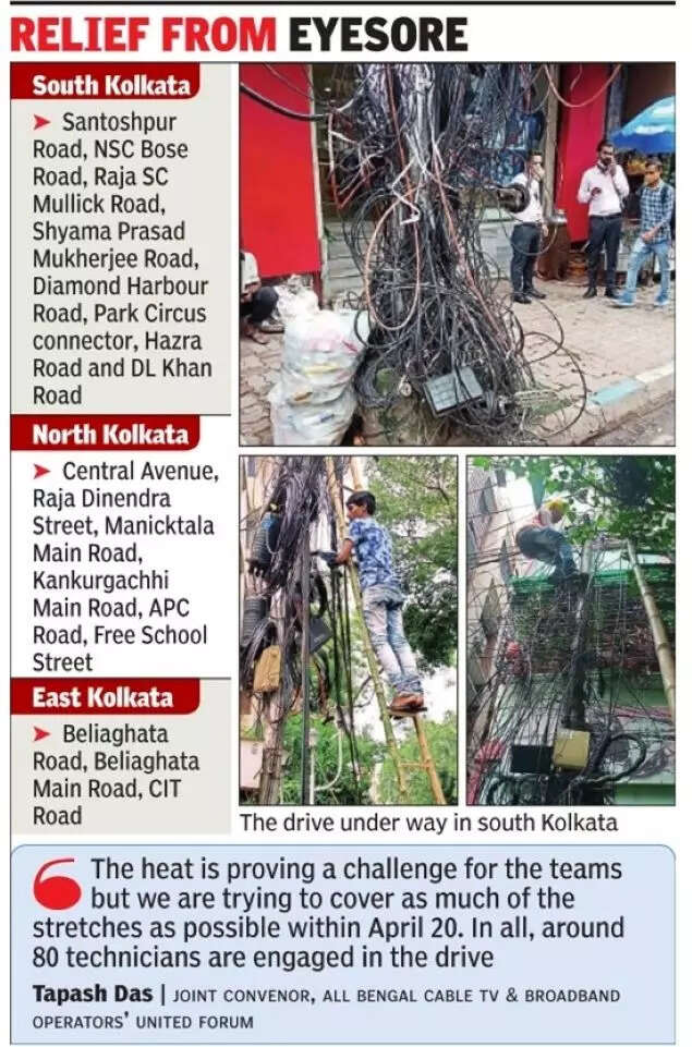 KOLKATA: Cable operators and internet service providers have kicked off the biggest drive till date to remove the overhead cable clutter across 250km-300km of city roads. In the first phase, the mesh of cables was dressed and redundant cables were removed from 75km-80km of roads while in the second phase, the drive covered around 150km.