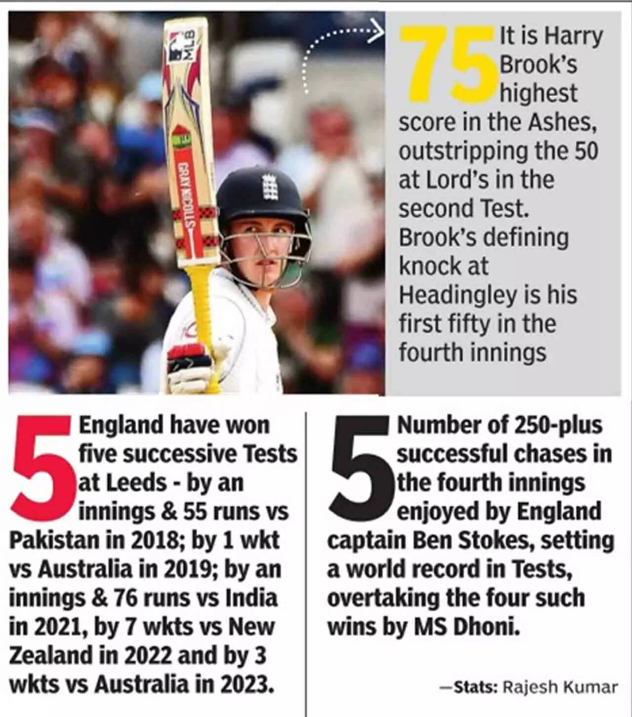 NEW DELHI: A match-defining half-century from Harry Brook was followed by lower-order heroics from Chris Woakes and Mark Wood as England pipped Australia by three wickets in a thriller to remain alive in the Ashes series in Leeds on Sunday.