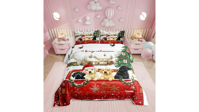 Spruce up the guest bedroom for next Christmas with the red truck Xmas bedding set. This queen bedding set from Walmart features a charming winter Christmas scene, including four cute dogs in the back of a red truck, finished with Christmas tree and snowflake accents. Get more than 25% off the original price of $76.99.