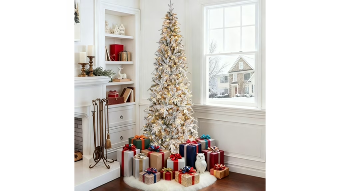 The seven-foot Qunler pre-lit snow flocked Christmas tree has warm white LED lights with eight lighting modes. This tree from Walmart is supported by a heavy-duty metal stand secured with three bolts for added stability and designed with hinged sections for a 15 to 30 minute setup as branches naturally fall into place. Crafted from non-flammable, non-allergenic flocked material that reduces shedding, the 892 snow-flocked branch tips deliver a full, realistic winter-wonderland appearance. When purchasing online for next year, save $196.