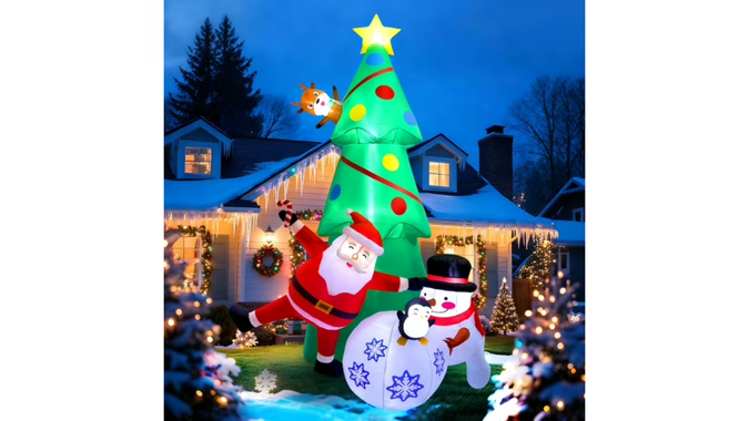 The Ayieyill inflatable Christmas tree inflates to 10 feet tall, featuring a reindeer at the top and Santa, a snowman and a large snowball with a penguin at the base. The built-in blower brings the decoration to full size in roughly 60 seconds once plugged in. Included with the inflatable tree are ground stakes, ropes, sandbags, a blower and an adapter. Receive $100 off when buying online at Walmart.com ahead of next Christmas.
