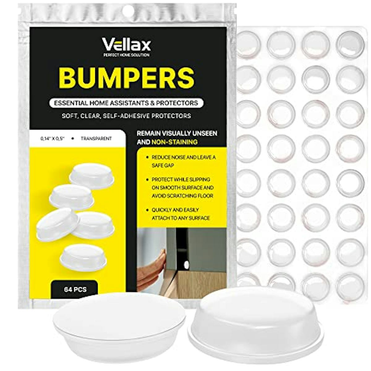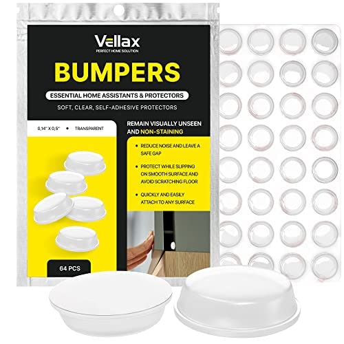 Vellax Cabinet Door Bumpers 64 Pcs - 1/2” Diameter Clear Self Adhesive Pads, Cabinet Stoppers, Rubber Bumpers for Drawers, Cupboards, Cutting Boards, Glass Tops, Picture Frames, Kitchen Furniture