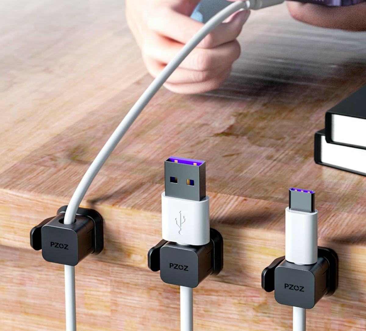 One more option in accordance with Gurskyi’s advice? This larger cord-holding strip that can be stuck anywhere. This option is especially low profile and makes it easy to stick cords in whichever slot is available, and to remove them quickly when you need them. This cord organizer has space for five different cords — one for each of your devices.