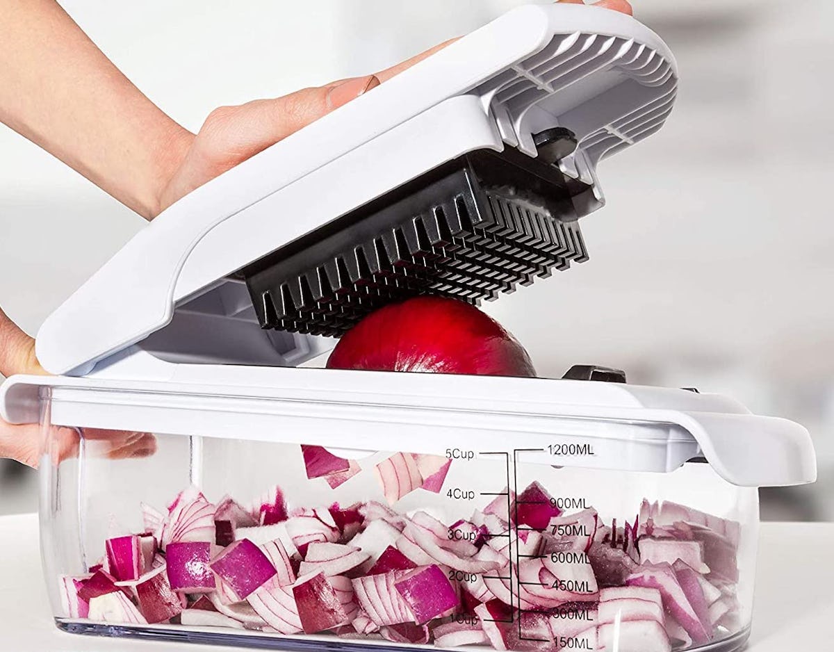 This durable kitchen gadget allows you to chop veggies in seconds, making meal prep so much faster. The chopper features four stainless steel blade heads that can be used to dice, spiralize, and more. The nonslip bottom helps it stay securely in place as you cut, and the collection bin has a generous 5-cup storage capacity. Plus, everything is dishwasher safe for quick cleanup.