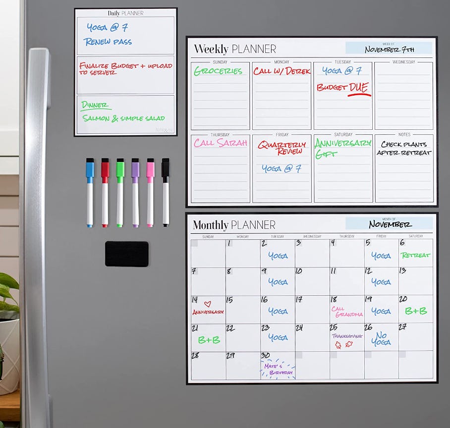 These magnetic calendars come in a set of three for planning out your month, week, and day. Thanks to the dry-erase surface, you can use the calendars over and over again. The set comes with six colorful markers with built-in eraser caps, and the markers are also magnetic — so they can sit right next to the calendars for easy access.