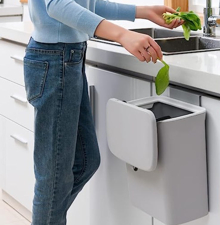 This convenient hanging trash bin cuts down on meal prep time and cleanup, because you can scoop trash directly from the counter into the can. Designed with a tightly fitting lid to lock in odors, the trash bin can be installed over the side of a cabinet with the included hook or attached to a surface via adhesive.