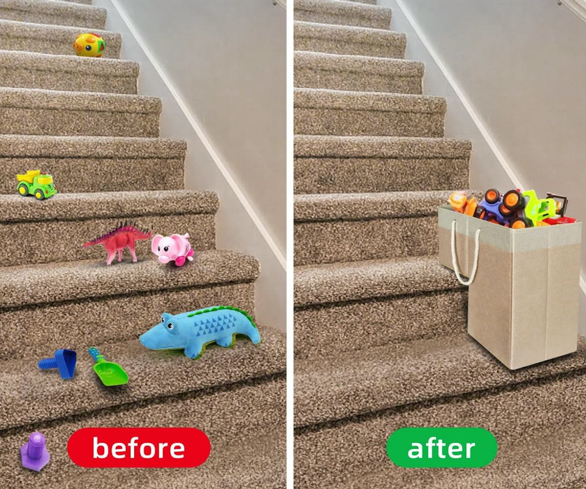 This basket features an L-shaped design that makes it a perfect fit for the stairs. Instead of running up and down to put things away, pop them in the basket to take everything up all at once. The tote is made from durable cotton and linen and features a nonslip bottom to keep it in place. When it’s not in use, you can fold it down for compact storage.