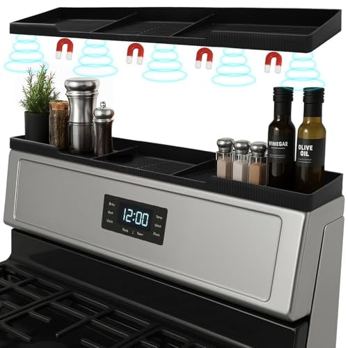 Silicone Magnetic Stove Shelf For Back Of Stove - Over The Stove Shelf, Magnetic Stove Top Shelf, Over The Stove Spice Rack, Oven Shelf For Top Of Stove, Heat Resistant, Includes 6 Extra Plates, Black