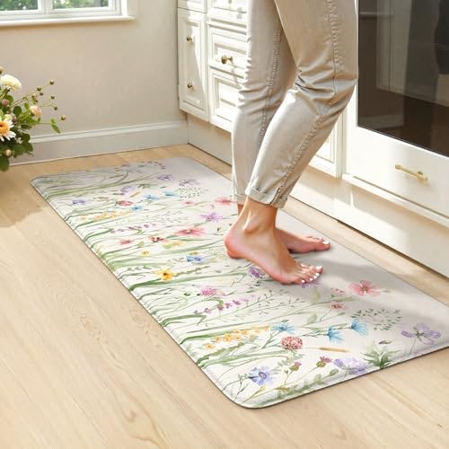 KIMODE Anti Fatigue Mats for Kitchen Floor, 20"x39" White Floral Kitchen Rug, Cushioned Kitchen Floor Mat Non Slip, Memory Foam Standing Mat for Sink Laundry Office Desk