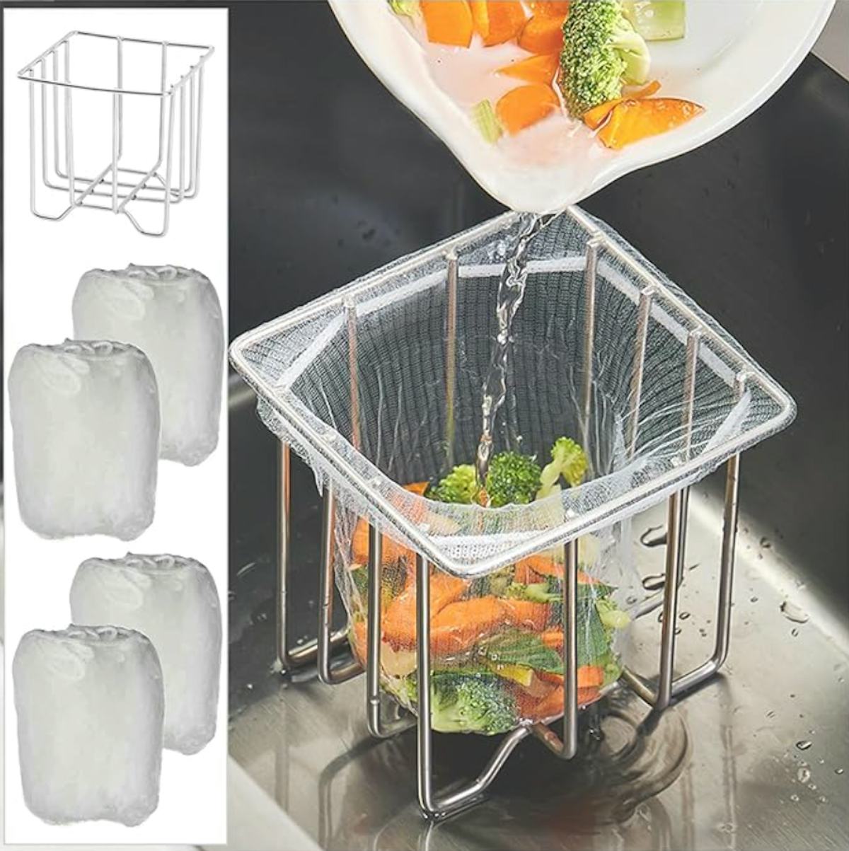 This metal basket and disposable mesh filter bag set is an ingenious idea because of how easy they make it to separate food from liquid when you’re getting rid of leftovers. Simply add the bag into the basket, pour, and all the solids get stuck while the liquids can drain down the sink. This way, you can easily dispose of food so it doesn’t go down your sink.