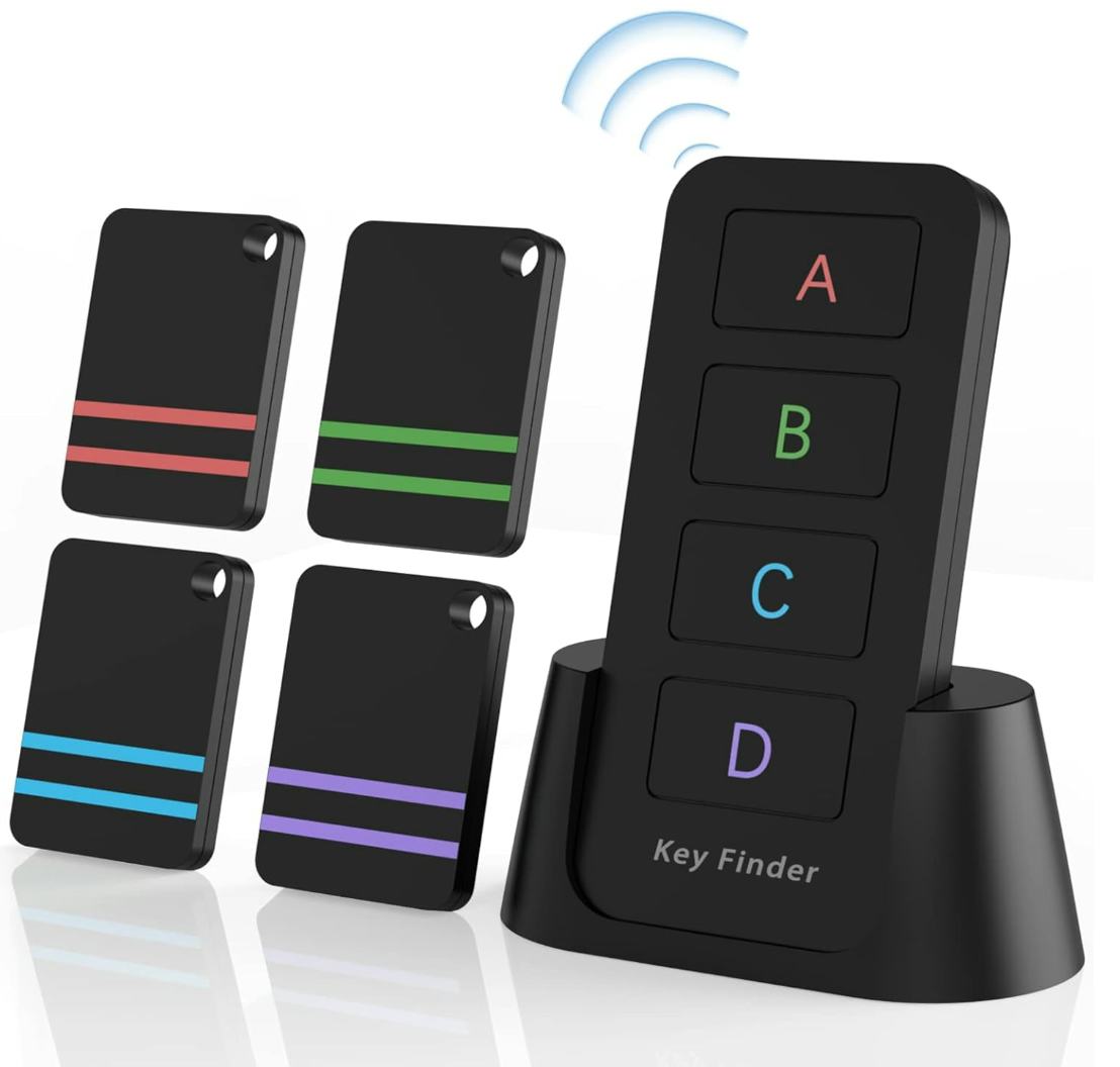 This alarm comes with four fobs that you can stick onto your remote controls, phones, keys, wallet, or any other frequently lost household item to help you find it. When you press the coordinating button on the base, an alarm sounds and helps you locate things up to 120 feet away — no Bluetooth or app required.