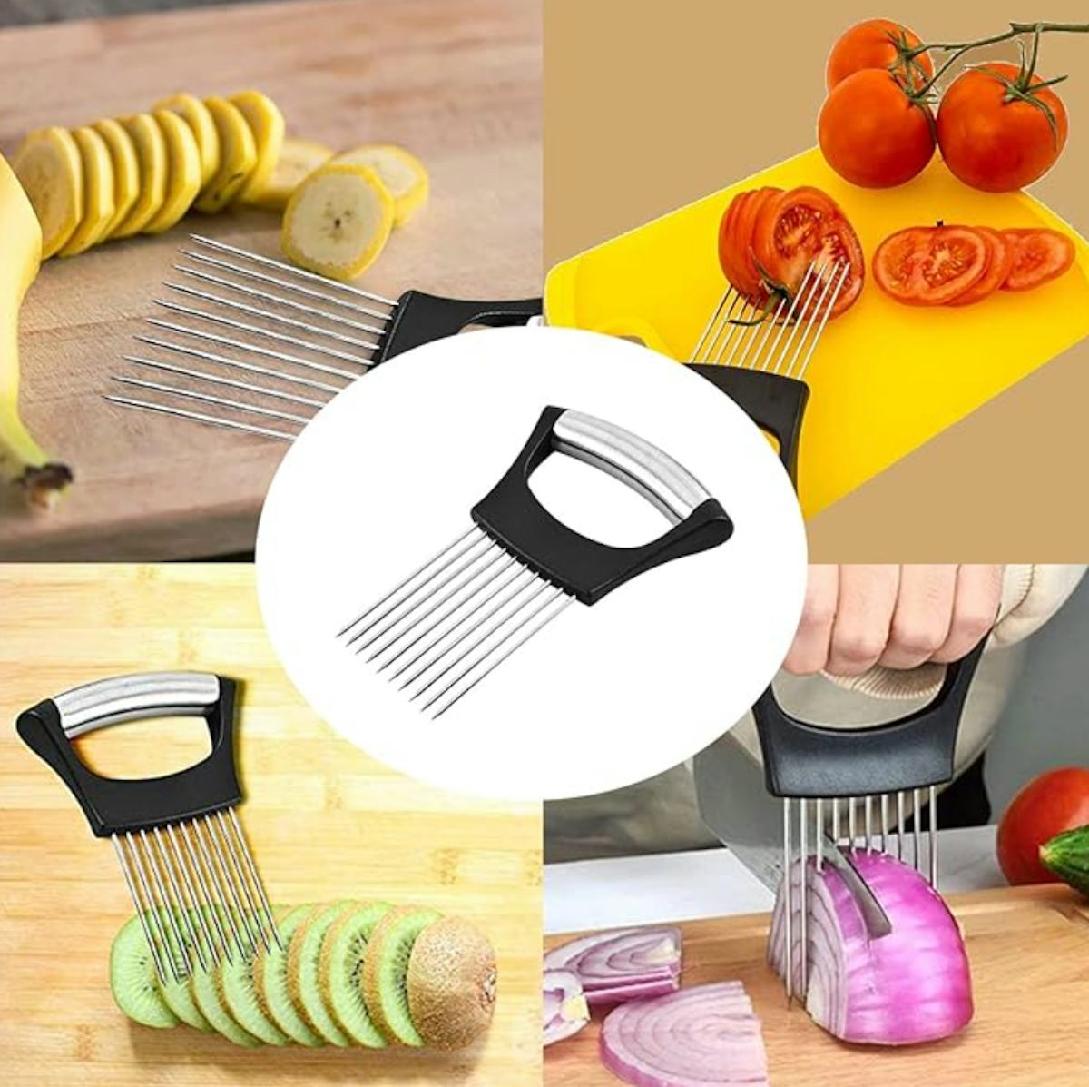 A stainless steel holder to make slicing produce evenly a breeze