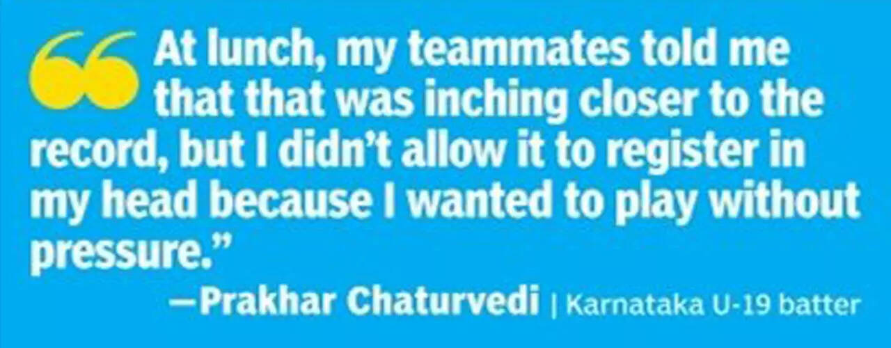 Asked if he was aware of Yuvraj’s record, the Jabalpur-born Prakhar, who moved to Karnataka as a two-year-old, revealed, “At lunch, my teammates told me I was inching closer to the record, but I didn’t allow it to register in my head because I wanted to play without pressure. There were times during the innings when I was tired, but I just kept pushing myself.”