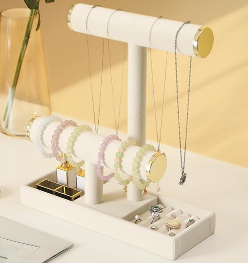 This jewelry stand is a beautiful and expensive-looking way to display all your favorite baubles, keeping everything organized and easy to see at a glance. The top tier is perfect for preventing necklaces from tangling while you’re not wearing them, while the bottom tier can hold up to 12 bracelets. Plus, the bottom tray has slots designed for rings and an area for everything else — watches, earrings, and more.