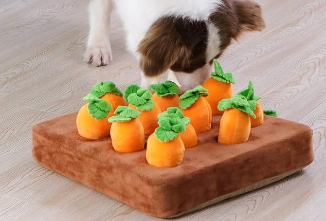 This snuffle mat will keep your hound sniffing among the carrots, hunting for treats for hours. When the treats have all been found, each carrot is a fun toy. And when it is just kicking around the house, it looks cartoonishly cute, so you won’t feel the need to stash it out of sight. Choose the squeak version or the silent one.