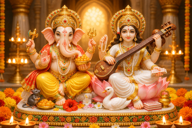 Saraswatiare often worshipped together.