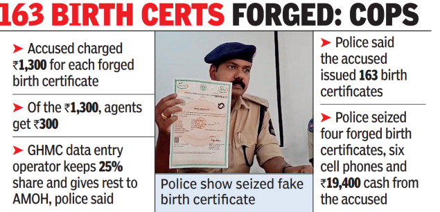 The main accused Aizaz Khasim, who is an AMOH with GHMC, Khairatabad, and another agent Ankit of Secunderabad are absconding. Police seized four birth certificates issued through fraudulent means, six cell phones and ₹19,400 cash from the accused.