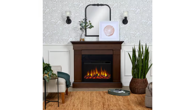 An electric fireplace can help reduce home heating costs if you only need to warm a single room. It also adds cozy ambiance to a living room, dining room or other family gathering space. The Crawford slimline freestanding electric fireplace by Real Flame heats up to 1,000 square fit and features six thermostat settings for maximum comfort. You can also turn off the heat but set the flame to glow in your choice of six colors.