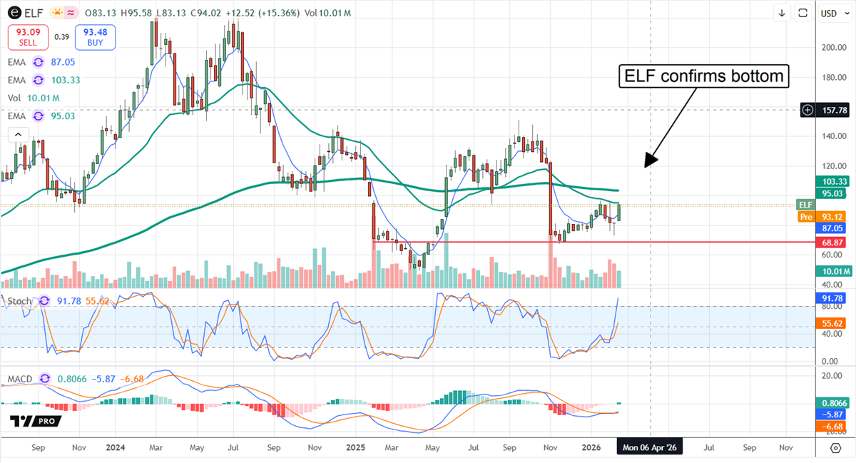 e.l.f. Beauty (NYSE: ELF) is in the midst of a turnaround driven by outperformance, operational excellence, market share gains, and a robust growth outlook. The stock price confirmed its bottom in February, following the earnings release, and indicates a buyable bottom is in place. The report included an aggressive 2026 guide, with revenue and earnings growth well-above expectations at the low end of the range.