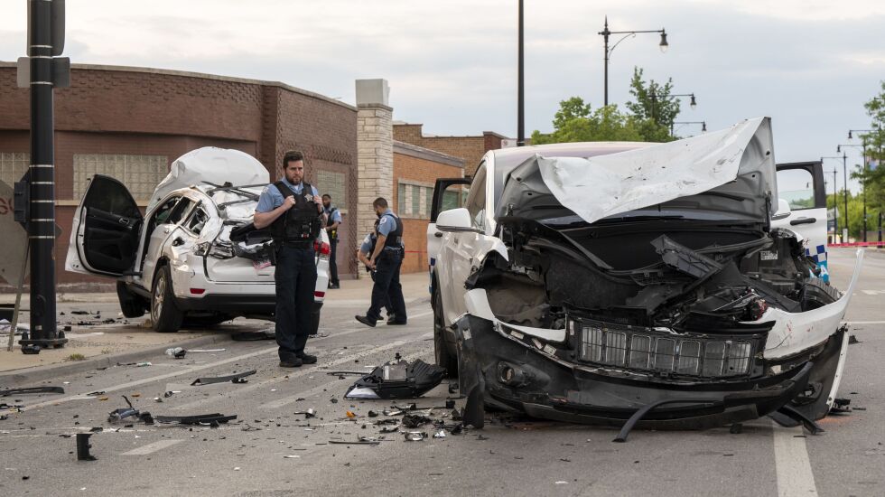 Just before 7 p.m., a man, 29, driving an SUV drove through a traffic light in the 700 block of West Root Street and struck the side of a minivan which then hit a poll, Chicago police said.