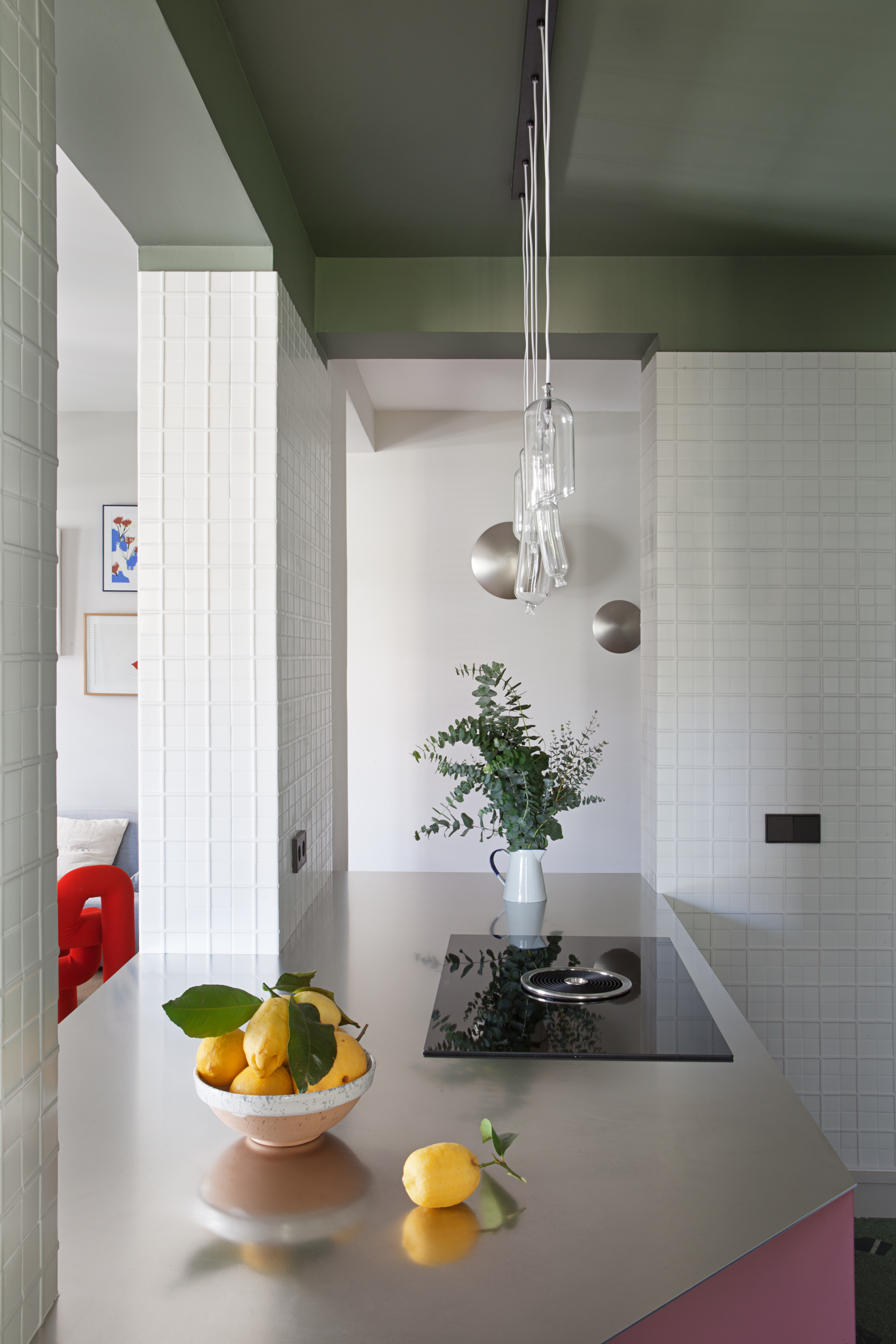 “In this apartment, the kitchen is the heart of the home, and everything is designed around it,” say the designers. “Materials play an important role — gresite, terrazzo, lacquered and perforated metals — each with an industrial background, brought together through a controlled use of color that runs consistently throughout the design.”
