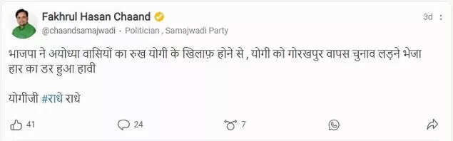 SP spokesperson Fakhrul Hasan Chaand gave another reason for Yogi Adityanath's candidature from Gorakhpur. In a Koo post in Hindi, he said: "The BJP has sent Yogi back to Gorakhpur due to the negative mood of the people of Ayodhya against him. The fear of defeat prevailed."