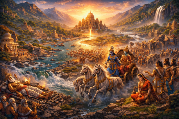 The Mahabharata, attributed to Maharishi Ved Vyasa, is not only an epic of war. It is a deep exploration of human choices and their consequences. The rivers flowing through its narrative mirror the laws of karma and dharma that guide human life.