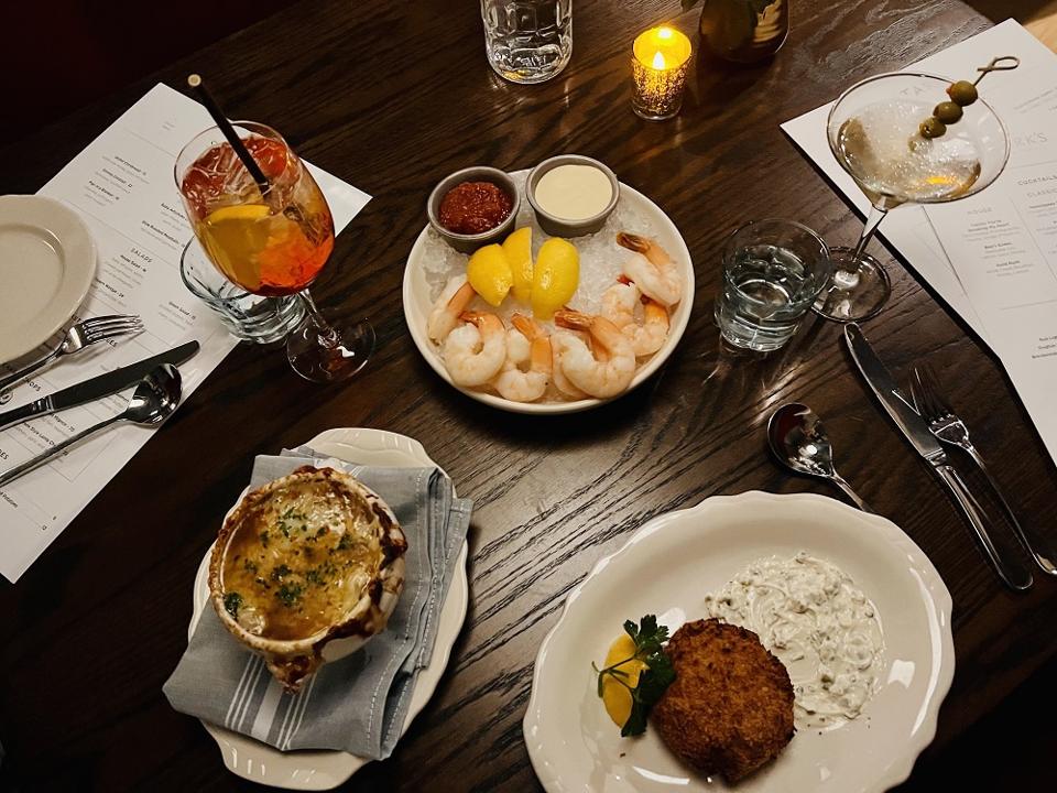 French onion soup, crab cakes, shrimp cocktail, and cocktails at Stark's Alpine Grill. Tropical Disco Media