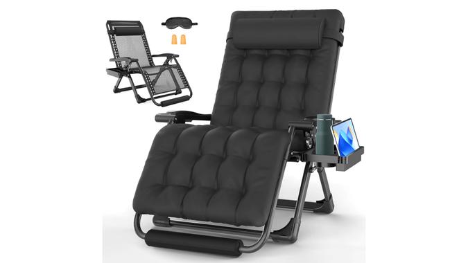 GVDV zero-gravity chair features a headrest pillow, side tray, a thick steel frame that can support up to 500 pounds, a nonslip footrest and a removable cushion.